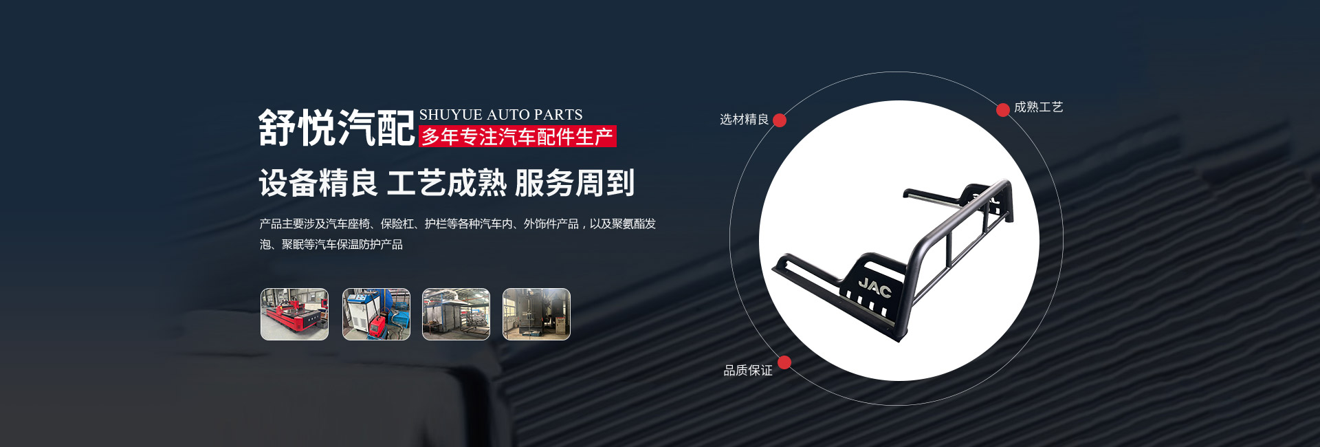 揚(yáng)州舒悅汽配有限公司經(jīng)過多年的穩(wěn)定發(fā)展,業(yè)績一直蒸蒸日上。公司產(chǎn)品主要涉及汽車座椅、保險杠、護(hù)欄等各種汽車內(nèi)、外飾件產(chǎn)品,以及聚氨酯發(fā)泡、聚脲等汽車保溫防護(hù)產(chǎn)品。其主要是為江淮、金龍,奇瑞等公司服務(wù),已連續(xù)多年成為江淮、金龍等公司的A級供應(yīng)商。        公司成立于1997年,現(xiàn)坐落于揚(yáng)州市儀征劉集盤古工業(yè)集中區(qū)202號,公司占地面積26640平 方米,廠房建筑面積18512平方米。公司擁有先進(jìn)的制造設(shè)備、可靠的生產(chǎn)工藝、完善的檢測手段和科學(xué)的管理,在售前和售后服務(wù)中做到快速反應(yīng),應(yīng)急應(yīng)變,為客戶提供優(yōu)良產(chǎn)品和滿意服務(wù)。公司的產(chǎn)品開發(fā)能力和生產(chǎn)規(guī)模在同行業(yè)中處于前列的地位。        揚(yáng)州舒悅?cè)吮小罢\信雙嬴”的原則,發(fā)揚(yáng)“誠信、務(wù)實(shí)、創(chuàng)新、貢獻(xiàn)”的企業(yè)精神,恪守“顧客至上”的經(jīng)營宗旨,致精從業(yè),不斷引進(jìn)新技術(shù)、新材料。以優(yōu)良的產(chǎn)品、合理的價格和周到的服務(wù)參與市場競爭。公司愿與國內(nèi)外朋友建立真誠的合作伙伴關(guān)系,攜手共創(chuàng)輝煌!